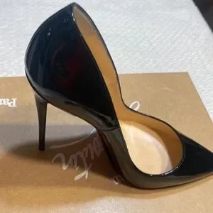 Elegant black patent leather heels. Signature red sole. Sleek and stylish design.