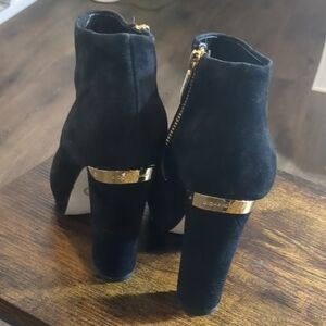 Chic black ankle boots with striking gold zipper. Perfect for stylish outings.