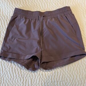Lululemon women’s shorts in muted taupe– lightweight, silky smooth fabric (quick-dry, comfortable—not compressive). Size unknown - fits like a lulu size 8