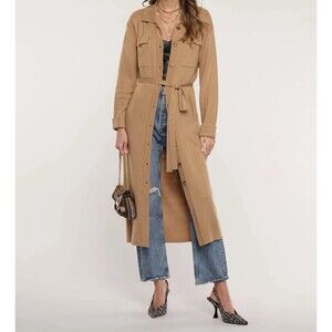 Stylish tan midi dress by Heartloom. Features button-down front and tie waist. Long sleeves with a chic collar. Perfect for versatile styling.