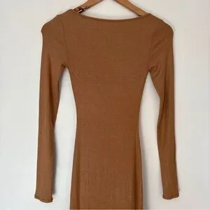 Chic tan maxi dress with long sleeves. Sleek and stylish design. Perfect for versatile wear.