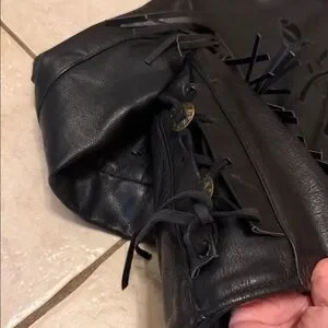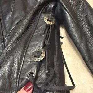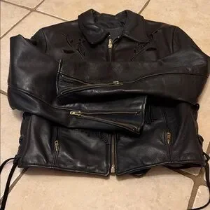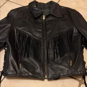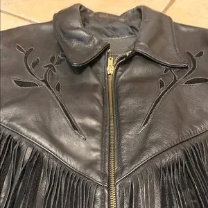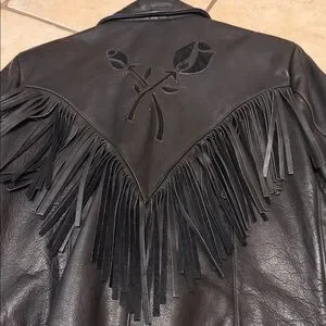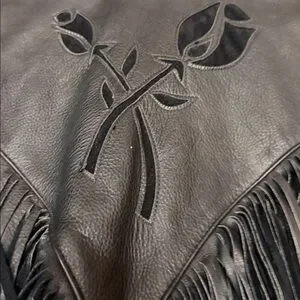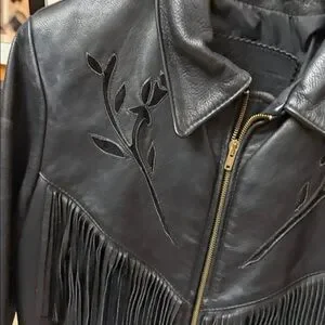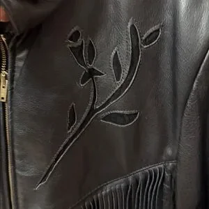 Chic black leather jacket. Features fringe and floral embroidery. Ideal for a bold look.
