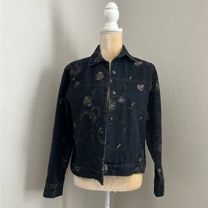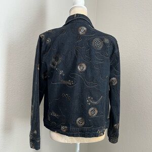 Stylish dark denim jacket featuring intricate embroidery. Perfect for adding a touch of elegance to any outfit