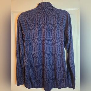 Designed as a classic, all-around baselayer, the Patagonia zip neck pullover features a smooth face for easy layering and a diamond-grid pattern on the inside for warmth and breathability. This top features a dark blue/purple geometric "Aztec" style print.