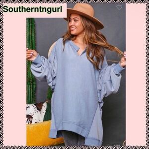 FANTASTIC FAWN Long Sleeve V Neck Oversized French Terry Mineral Wash Sweatshirt / Top