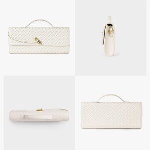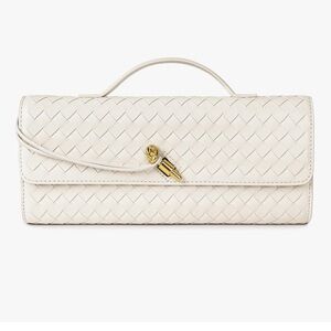This chic cream woven clutch adds a touch of elegance to any outfit. Its versatile design is perfect for both casual and formal occasions.