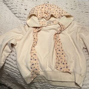 Stylish cream hoodie paired with a floral scarf. Perfect for casual outings.