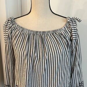 Casual in style and very lightweight. Has decorative ties on the shoulders and a little bit of a bell sleeve. Good condition. Fabric continent photos.