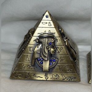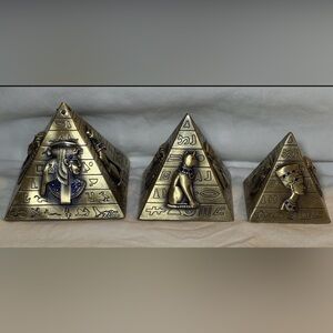 This set of 3 metal etched Egyptian pyramids featuring ancient Egyptian motifs, specifically with Cleopatra, Nefertiti, King Tut and Bastet the Cat Goddess, is a unique addition to any collection. These meticulously crafted paperweights showcase the rich cultural heritage and history of the Egypt. Perfect for collectors or those looking to add a touch of Egyptian charm to their decor, these pyramids are a symbol of timeless elegance and spirituality. Each are adorned with rhinestones and have felt bases. They measure 3.5", 2.75" and 2.25" square at the bases. Excellent condition.