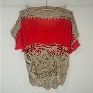 Mixed media design with an open-weave crochet body and a solid coral colored fabric.