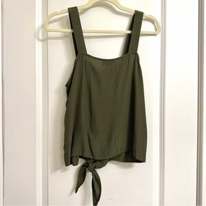 Chic olive green tank top with button-down front. Features a stylish tie at the hem. Ideal for casual wear.