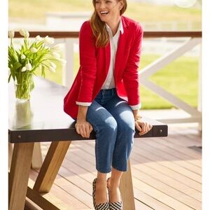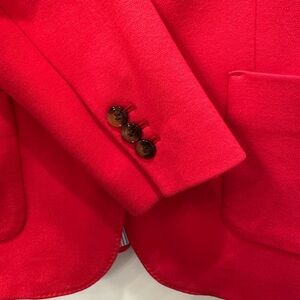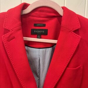 Chic red jacket by Talbots. Features a tailored fit and stylish pockets. Ideal for versatile wear.