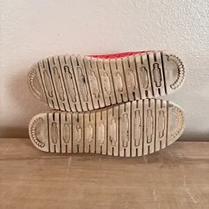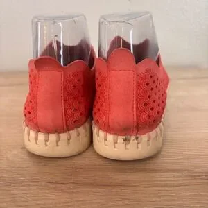 Ilse Jacobsen Tulip slip-on shoes in a vibrant red hue feature the brand's signature laser-cut scalloped pattern for maximum breathability. These lightweight flats are constructed with a flexible, whipstitched rubber sole and a soft microfiber upper, making them ideal for travel or all-day wear. The scalloped heel detail and cushioned footbed provide both style and comfort in a classic loafer-inspired silhouette. Note some general wear.