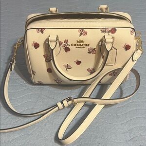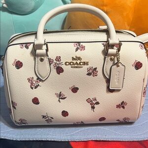 Chic Coach Rowan satchel with ladybug floral design. Features a detachable strap and top handles. Ideal for everyday elegance.pre-loved,in excellent condition.
