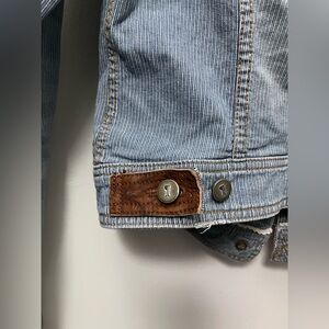 Stylish light blue distressed railroad denim jacket, with leather details. Features button closure and chest pockets. Perfect for casual wear. This is preowned garment, and is in overall excellent condition. No major signs of wear, and no stains or flaws noticed.