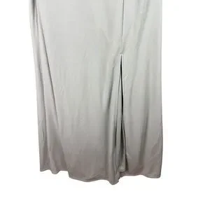 • Features: One-shoulder design, draped bodice, full-length hem, front slit, zip closure