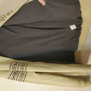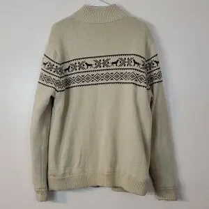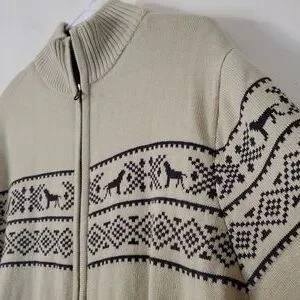 Mens preppy lined sweater jacket size extra large. Wool blend. Thick and heavy. Soft warm and luxurious. Dog and Fairisle graphics. Good pre-owned condition. Approximate measurements provided. There is one tiny tiny spot bit it looks surface. Please refer to photo's for reference. Preppy. Classic. Western. Equestrian. Holiday.