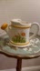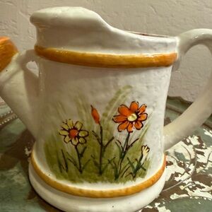 Charming Vintage ceramic watering can vase with floral design. Features white and orange flowers.