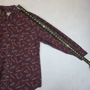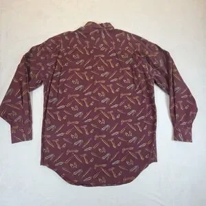 This vintage Banana Republic Safari button-up shirt is a stylish and unique addition to any man's wardrobe. Made of cotton in a rich burgundy color, this shirt features a classic long sleeve and button-front style with a touch of Edwardian flair. With a shoulder to hem length of 32 inches, this shirt was manufactured in Thailand during the 1990s, making it a piece of history with a timeless appeal. Perfect for casual occasions, this shirt is a versatile and fashionable choice for men looking for a standout piece in their collection. No pets or smoke.