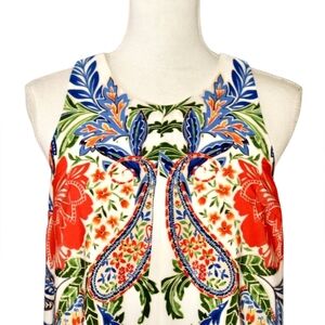 Beautiful dress featuring a vibrant floral and paisley print in bold red, cobalt blue, and fresh green against a crisp ivory background.