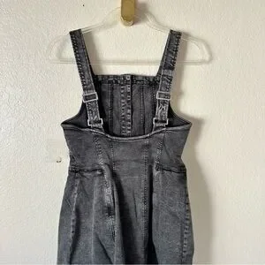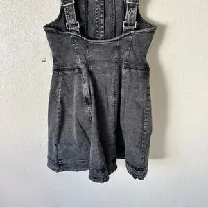 Features: Soft denim fabrication with a stretchy feel, square-neckline, wide adjustable shoulder straps, button-front closures, smocked back panel