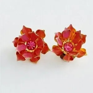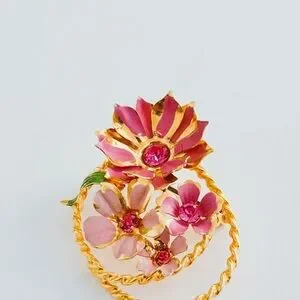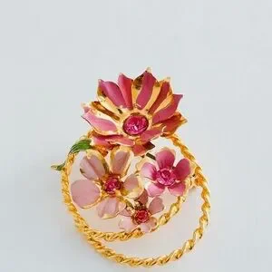 Vintage Brooch & Earring Set Pink Flowers, Rhinestones Gold Tone.