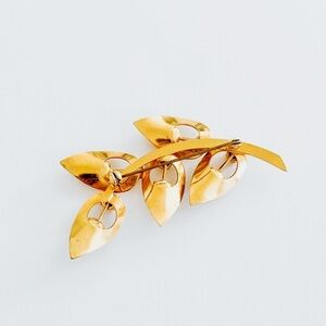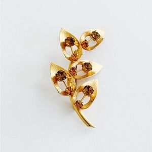 Mid-Century Gold tone Brooch Leaves Amber Rhinestones 2.5” x Length Aprox 1.25” Wide