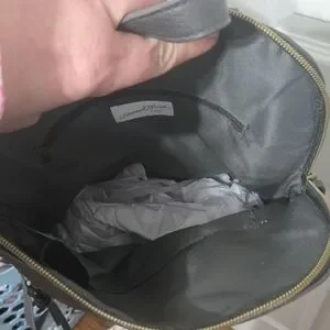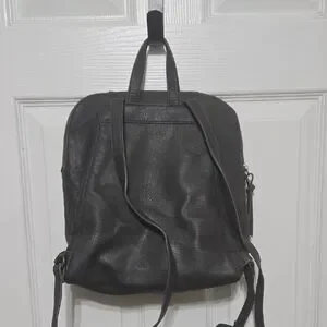 Stylish gray vegan leather backpack. Features front zipper pocket. Ideal for everyday use.