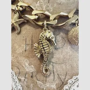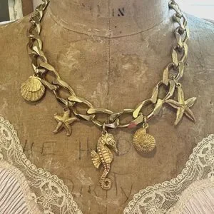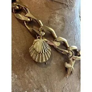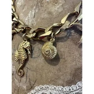 Make a statement with this stunning vintage Christian Dior gold-tone charm necklace. Featuring a chunky chain adorned with five intricate sea life charms — a seahorse, starfish, scallop shell, and two textured seashell designs — this piece is a true conversation starter. The chain has some light surface wear and minor pitting, adding to its vintage charm without compromising its bold, designer appeal. Complete with an adjustable chain for versatile styling, this necklace is perfect for adding a touch of coastal elegance to your outfit. A rare and collectible Dior piece that's sure to turn heads!
