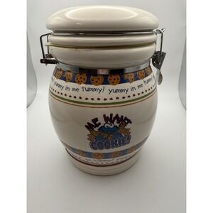 Relive your childhood with this adorable Cookie Monster ceramic cookie jar from 2006, featuring the classic phrase "Me Want Cookie!" in raised lettering. Officially licensed Sesame Street product.