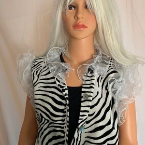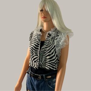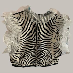 Elevate your style with this striking zebra print blouse featuring playful ruffle sleeves. A perfect choice for a bold fashion statement.