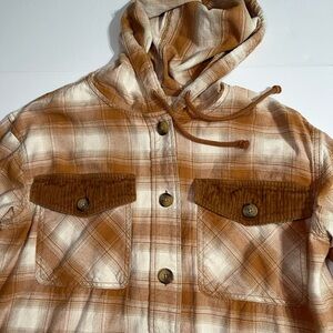 Elevate your style with this chic plaid utility jacket. Designed with a hood and button-up front, it's perfect for layering in cooler weather.