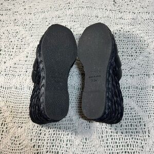 Chic black leather mules with woven design. Effortless elegance for any outfit.