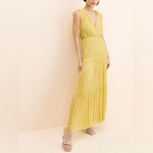 Size small, yellow/green color (color code 237), maxi dress, adjustable tie straps, Plisse maxi dress in tiered silhouette and metallic fabrication