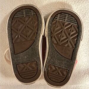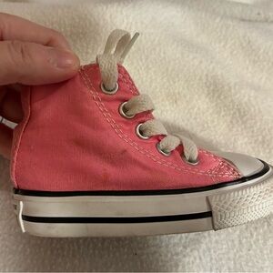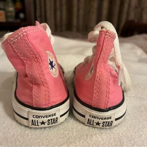Bright pink Converse high-tops for infant. Stylish and comfortable for everyday wear. Baby girl’s size 4. SO DARN CUTE!!! 💕 In gently used condition, only minor tiny bit of staining on the right shoe-see pix. Why buy new, they’re only gonna grow out of them 😊