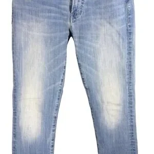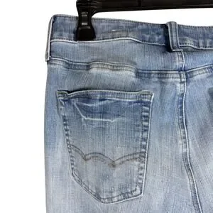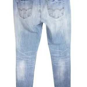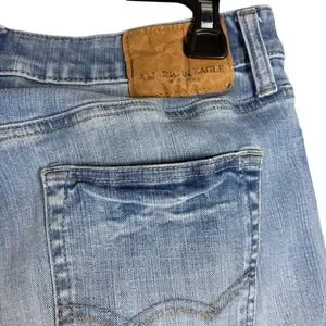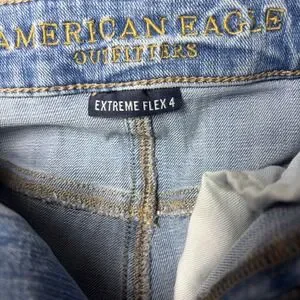 American Eagle Outfitters Extreme Flex 4 jeans offer a comfortable slim fit with superior stretch for all-day wear. These light wash denim pants feature classic five-pocket styling and a versatile faded aesthetic through the thighs and knees. The blended fabric provides a soft feel while maintaining its shape, making them an ideal choice for casual everyday outfits. Finished with a zip fly and button closure, these jeans combine a timeless look with modern flexibility.