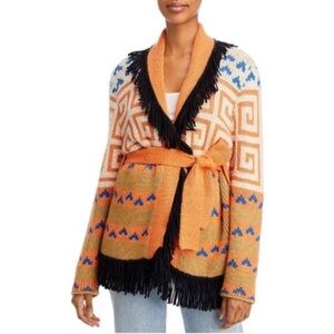 This mid-length cardigan has a shawl collar with fringe along the hem, a belted waist and an oversized fit.