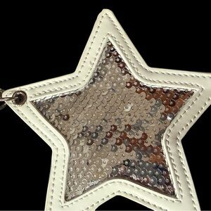 Design: A structured mini shoulder bag featuring a black flap and body with white side panels and dual white racing stripes on the front; comes with a decorative, detachable rhinestone star keychain or bag charm.