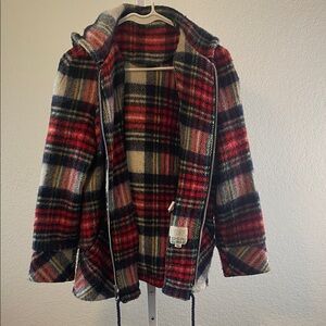 Embrace warmth and style with this cozy plaid teddy jacket. Featuring a striking red and black pattern, it's perfect for adding a bold touch to your winter wardrobe.