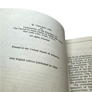 The Book of Mormon: Another Testament of Jesus Christ, published by The Church of Jesus Christ of Latter-day Saints. This 1981 edition features a navy blue textured softcover with elegant gold-tone lettering on the front and spine. A foundational religious text, it contains the first English edition publication date of 1830 on the copyright page. The interior pages are clean and well-preserved, featuring a double-column layout with comprehensive footnotes and cross-references for study. Printed in the United States of America, this copy serves as a significant spiritual resource and a classic addition to any religious library.