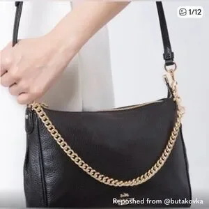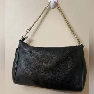 Sleek black shoulder bag with elegant gold chain. Perfect for any occasion.