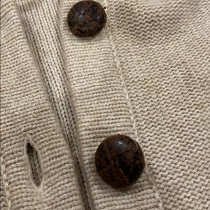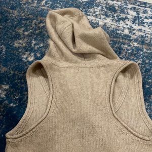 Stylish cream sweater vest. Features a hood and button front. Sleeveless design with pockets.
