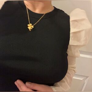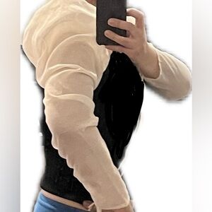 Elegant blouse with puff sleeves from ZARA. Contrast black body with sleeves. Perfect for chic occasions. Stretchy body, cinch the sleeves to 3/4 with drawstring. Knit body. . In good condition. Worn once. Has hanger clip marks from hanging for a while. Hard to find, don’t miss! New to Poshmark? Use code FOCALVISION for $15 off