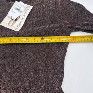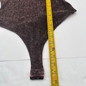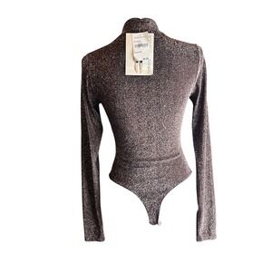 Sparkling metallic bodysuit from Naked Wardrobe features a high mock neckline and long sleeves. Designed with a thong back and a convenient two-snap gusset closure, this piece offers a sleek, tucked-in look. The rust-colored fabric is infused with a dense shimmer, perfect for layering or wearing as a statement top for evening events. Please note a small snag near the neckline as shown in photos. MSRP $58