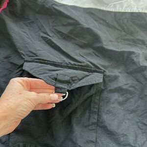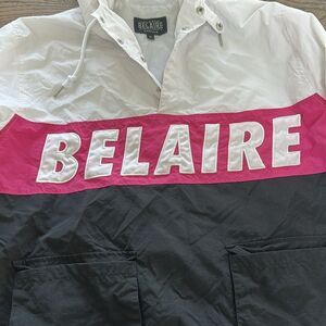 This Luc Belaire rare France windbreaker is a men’s extra large and is in excellent condition. A rare find and great streetwear unisex collectible. Features bold pink stripe with BELAIRE across the front and four snap closure at the neck. Drawstring windbreaker hood. Each sleeve has two snap closure to customize fit. Front pockets. Lined with a longer back hem. Back pockets with fold over flap and hook accent. Comfortable and trendy clean and like new. Men’s XL