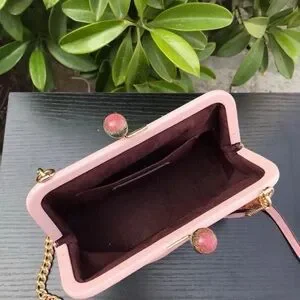 Design: Kisslock closure, removable chain strap, COACH logo plate on the front