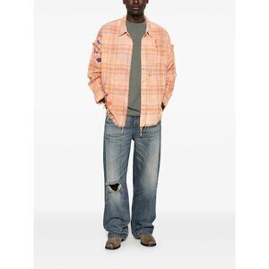 orange plaid pattern frayed hem front button fastening chest pocket long sleeves