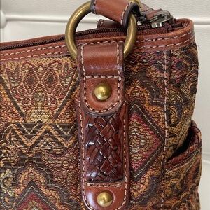 Elegant Fossil shoulder bag. Intricate pattern design. Braided handles. Perfect for any occasion.