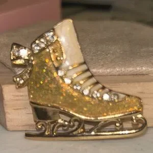 This beautiful vintage-inspired brooch features a radiant gold-tone finish and is pave-set with sparkling clear crystals along the boot and blade. It is the perfect commemorative accessory for a coat, scarf, or blazer to celebrate Team USA’s incredible performance this season.
