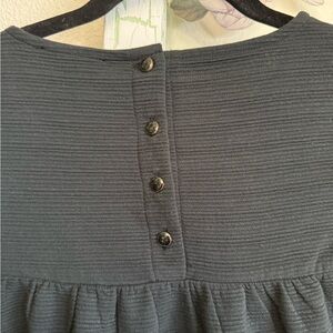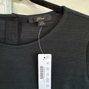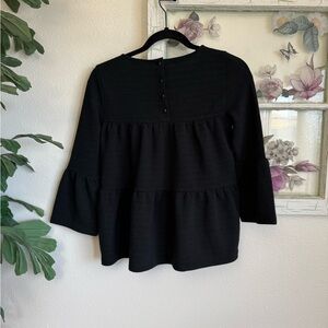 New with tags J.Crew black textured peplum top. Features a soft waffle knit texture, three quarter sleeves, and a relaxed peplum silhouette. The back has button detailing that adds a subtle design touch. Lightweight and easy to style with jeans, trousers, or skirts.